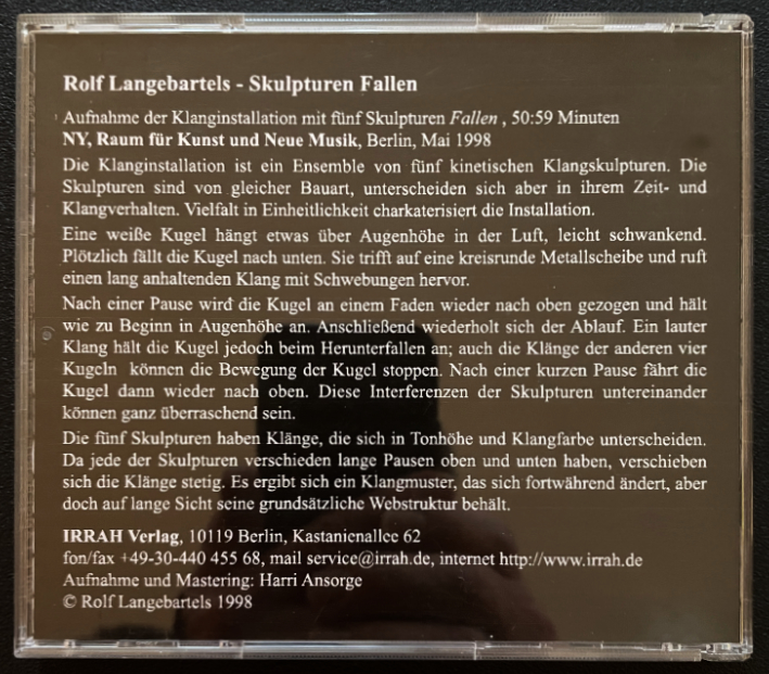 Recording of the sound installation with five sculptures falling, 50:59 minutes. NY, Raum für Kunst und Neue Musik, Berlin, Berlin, Germany, May 1998.